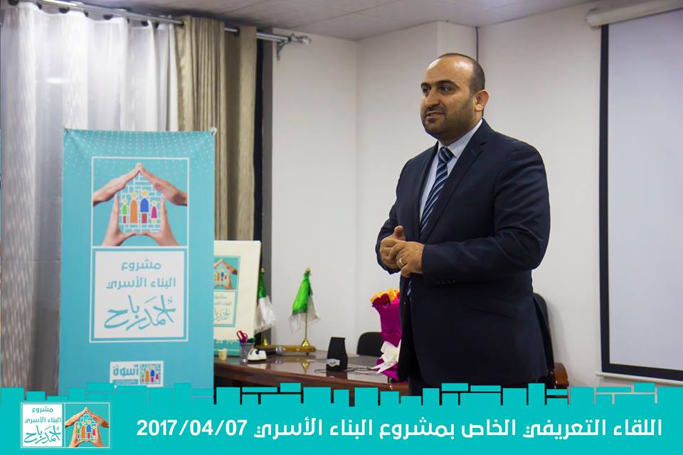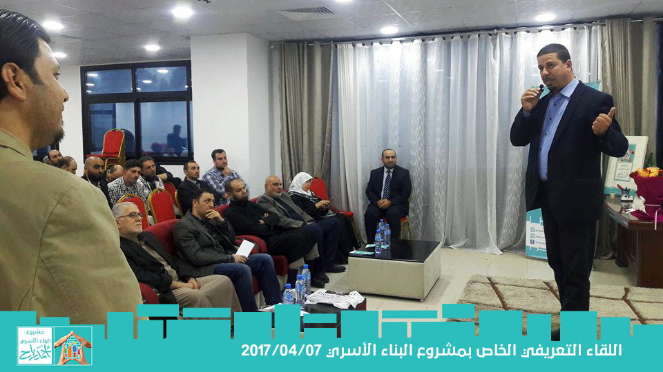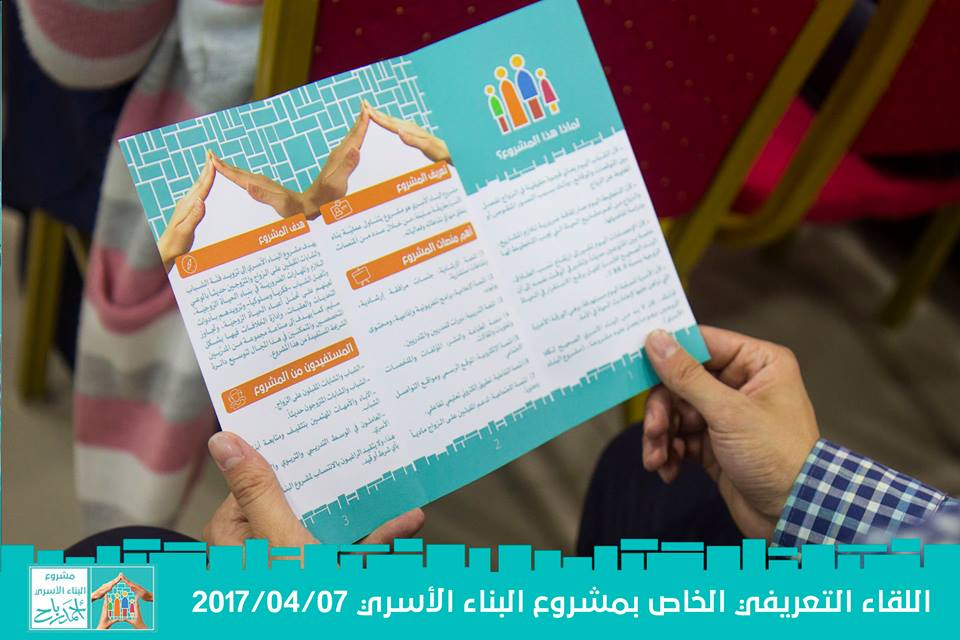 أقامت مؤسسة أسوة للبحث التربوي والبناء الأسري وقضايا الشباب اللقاء التعريفي الخاص بـ: (مشروع البناء الأسَري)، وذلك في يوم الجمعة 2017/04/07 م، ابتداء من الساعة 05.30 عصراً، في المحمدية مول - قاعة مؤسسة الأمير – الطابق الخامس.
